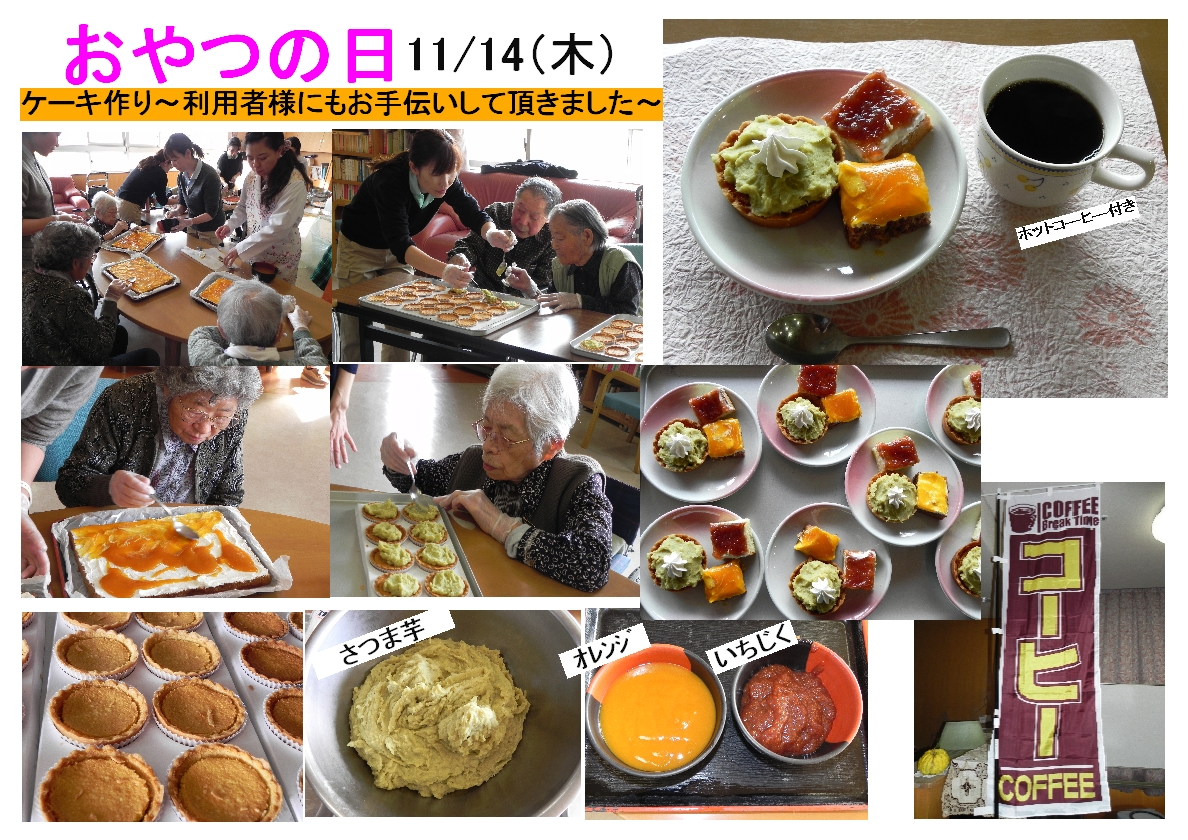 「食欲の秋」を楽しみましょう!と今年は、「おやつの日」と題し、ユー・アイの庭で採れたさつま芋、いちじく、みかんを使いケーキ作りを行いました。さつま芋はモンブラン風タルトに、いちじくとみかんはケーキのソースに。利用者様にもお手伝いいただき、美しく量もたっぷりのおやつとなりました。美味しいと好評で、秋の味覚を楽しんでいただきました。