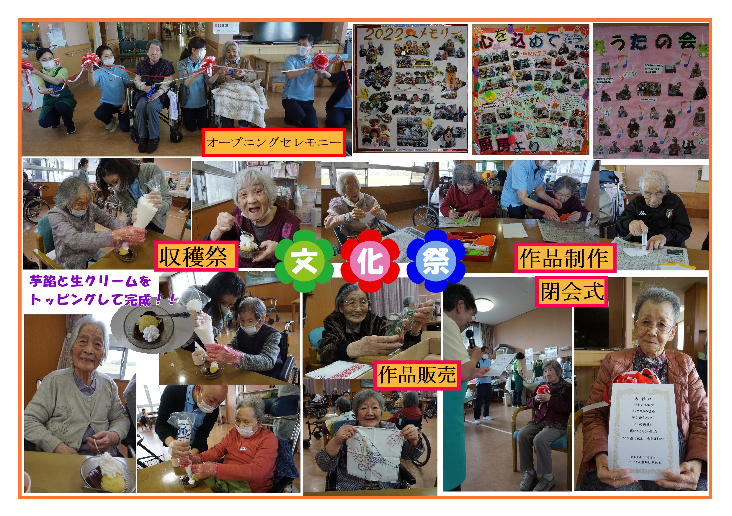第21回文化祭を開催いたしました。今年の作品制作は秋のガーランド制作を行いました。皆さん声をかけあいながら協力して取り組まれており、紅葉やイチョウなどの木の葉をモチーフにした色鮮やかな作品が完成しました。収穫祭では中庭に植えたさつま芋を収穫しました。芋堀り中は植え付け時の話などがたくさん聞けて、皆さん畑を気にかけて下さっていたことが伝わりました。収穫できた芋は、芋餡にして各自であんみつ風にトッピングを楽しみました。芋餡と生クリームを盛り付けて、笑顔いっぱいで召し上がっていました。